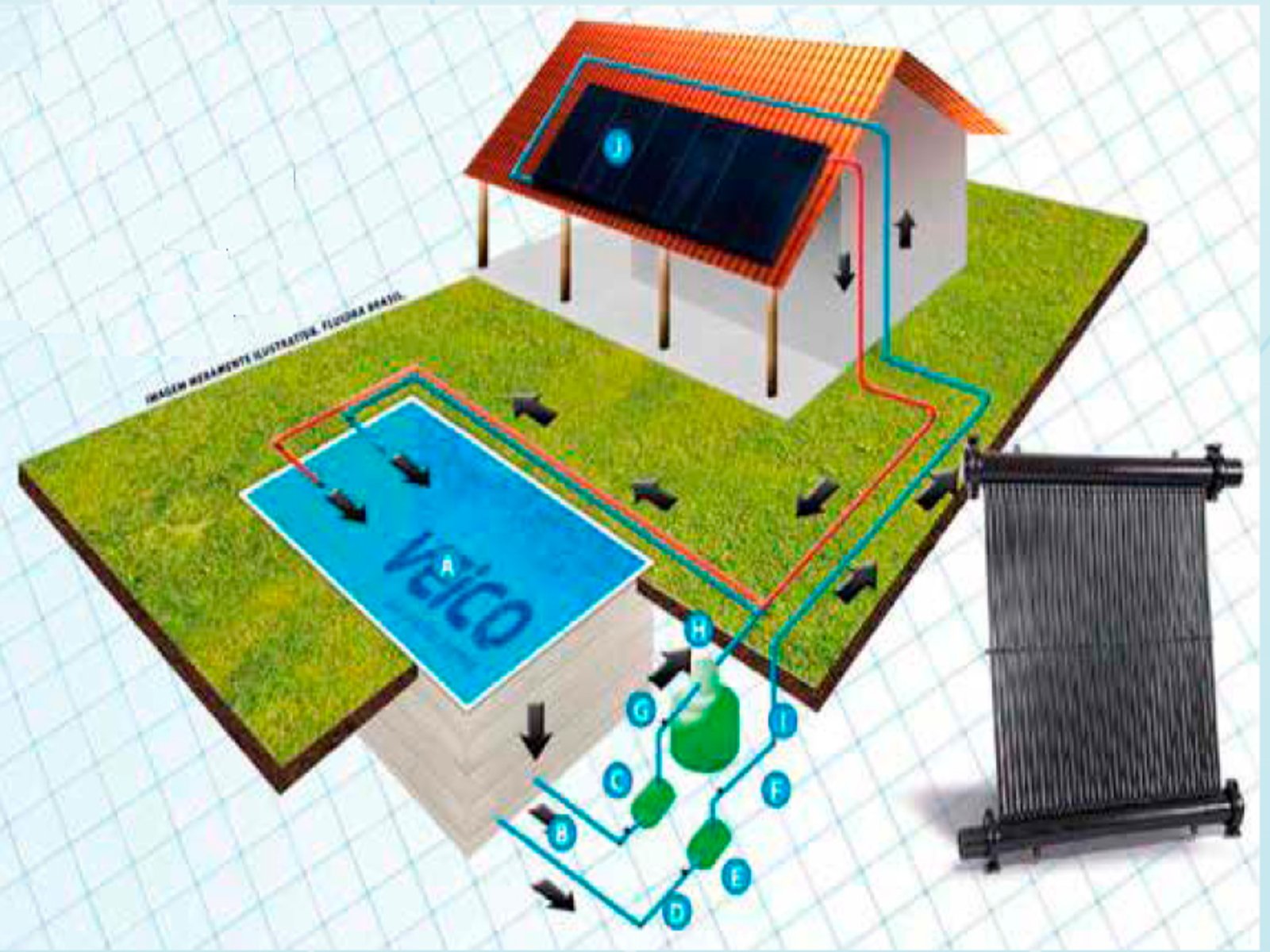 O sistema solar utiliza coletores (placas) para captar a energia do sol e aquecer a água da piscina. É uma solução sustentável, com baixo custo de operação.